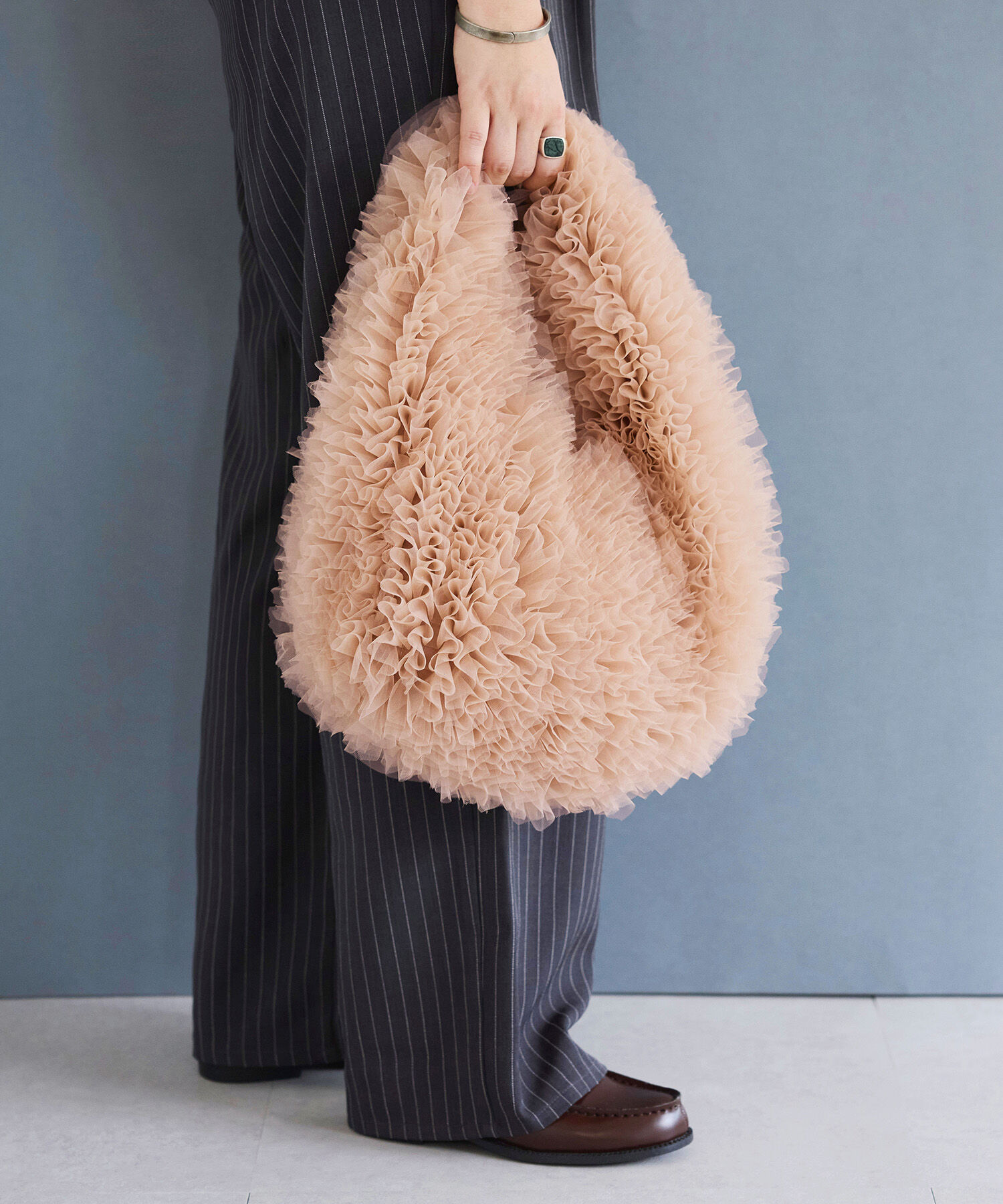 クチュールドレスのようなチュール素材のワンショルダーバッグ。丸みのあるフォルムに、フリルチュールをたっぷりとあしらい、繊細かつフェミニンなデザインに仕上げました。口元は荷物の出し入れ.. |