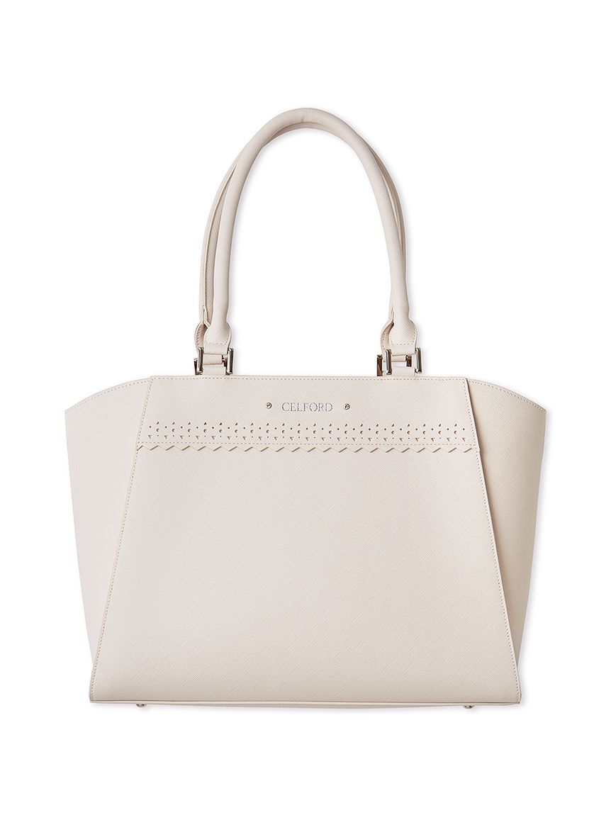 正面のカットワークが繊細で清楚な印象を与えるビジネスバッグ。中には13インチまでのノートPCが収納できるクッション入りのポケットの他、マチ付オープンポケット、長財布も収納できるファスナー.. |