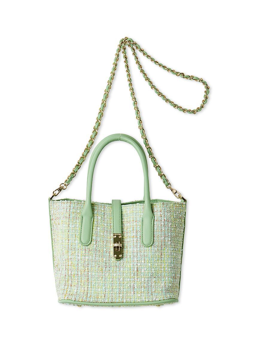 四角いマチが特徴の小ぶりのツイードトートバッグ。正面のオリジナルのビジュー付きひねり金具がデザインアクセント。口前の両サイドにベルトがついているので、ホックを留めて口を畳むことでシル.. |