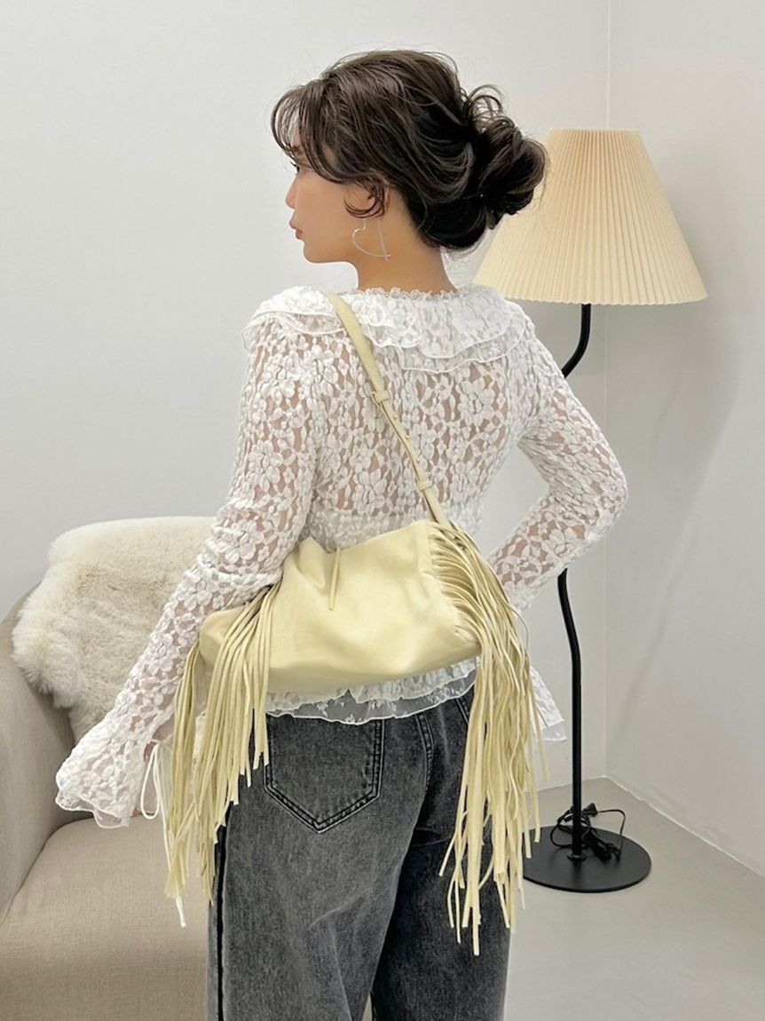 【フリンジ付きのスラウチバッグが洒落たアクセントをプラス】【Design/Styling】旬のスラウチバッグにフリンジをあしらい、洒落感を高めました。フリンジは長さをたっぷり持たせることで揺れ感が.. |