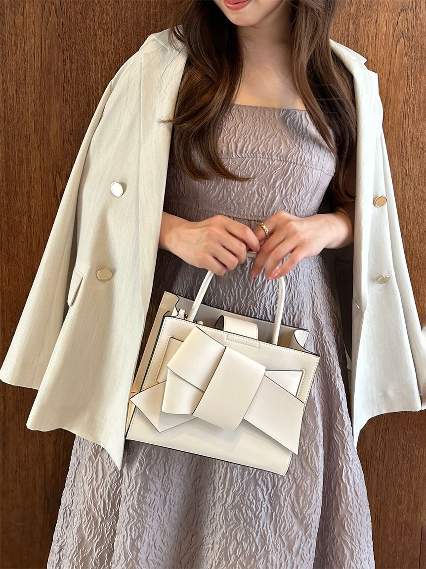 【リボン付きのドローストリングバッグで叶える洗練フェミニン】【Design/Styling】立体的なリボンが目を引くドローストリングバッグ。リュクスな合皮で仕立て、大人のフェミニン感を叶えました。.. |