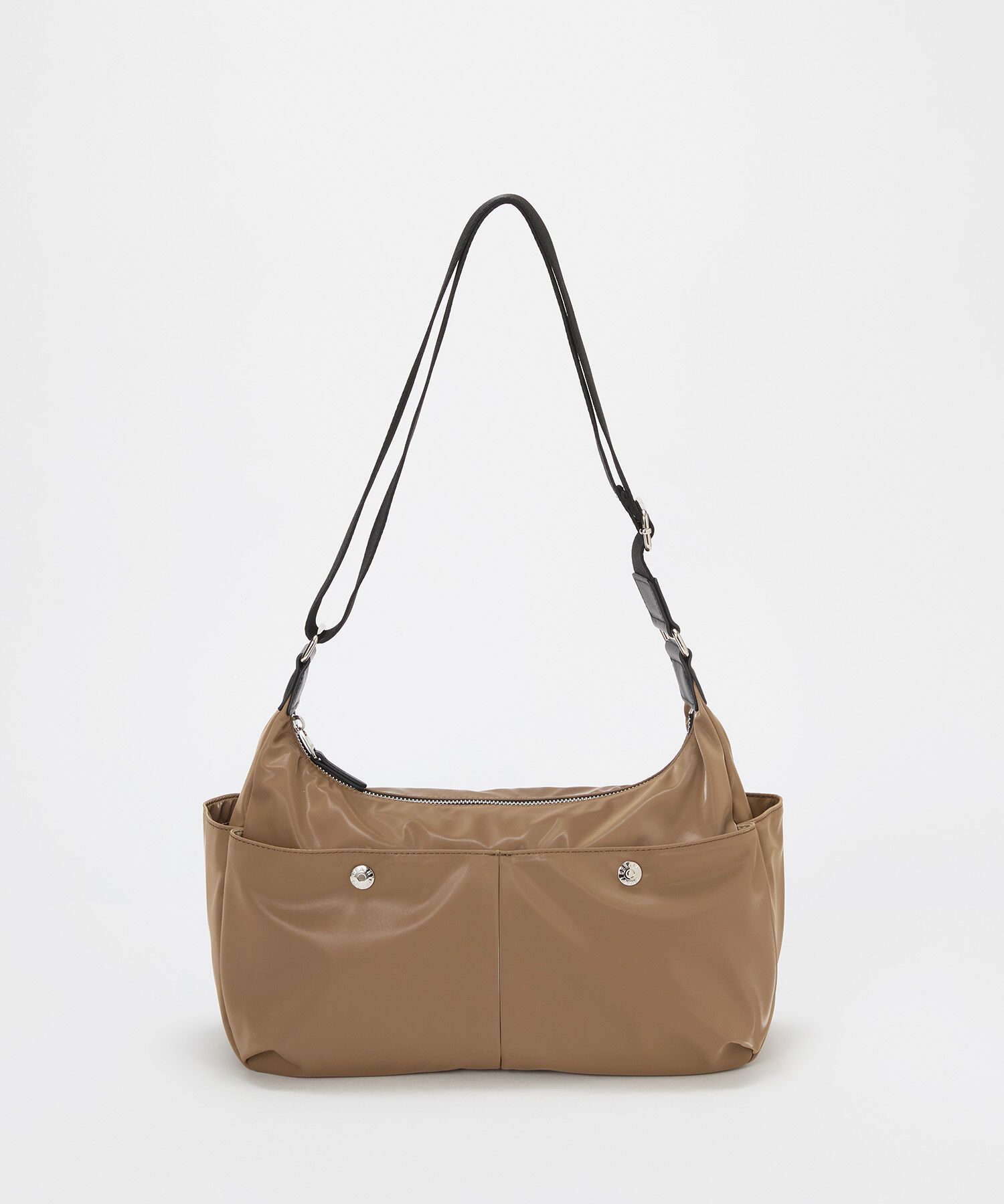 <毎日にちょうどいい、洗練ショルダー> 大人のデイリースタイルに寄り添う、上品でカジュアルなショルダーバッグ。 程よい光沢感のある本体に、バイカラーのレザーポケットとシルバーの金具を効.. |