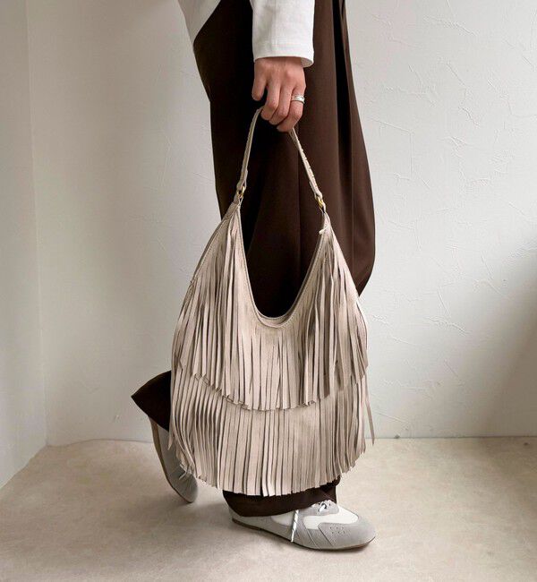 ◇fredy emue◇【2025 AW】秋冬ムード高まるスエードフリンジラウンドバッグ●point・柔らかなスエード素材を使用したシーズンムード高まるラウンドバッグ・目を惹くフリンジが動くたびに揺れ、存在感.. |