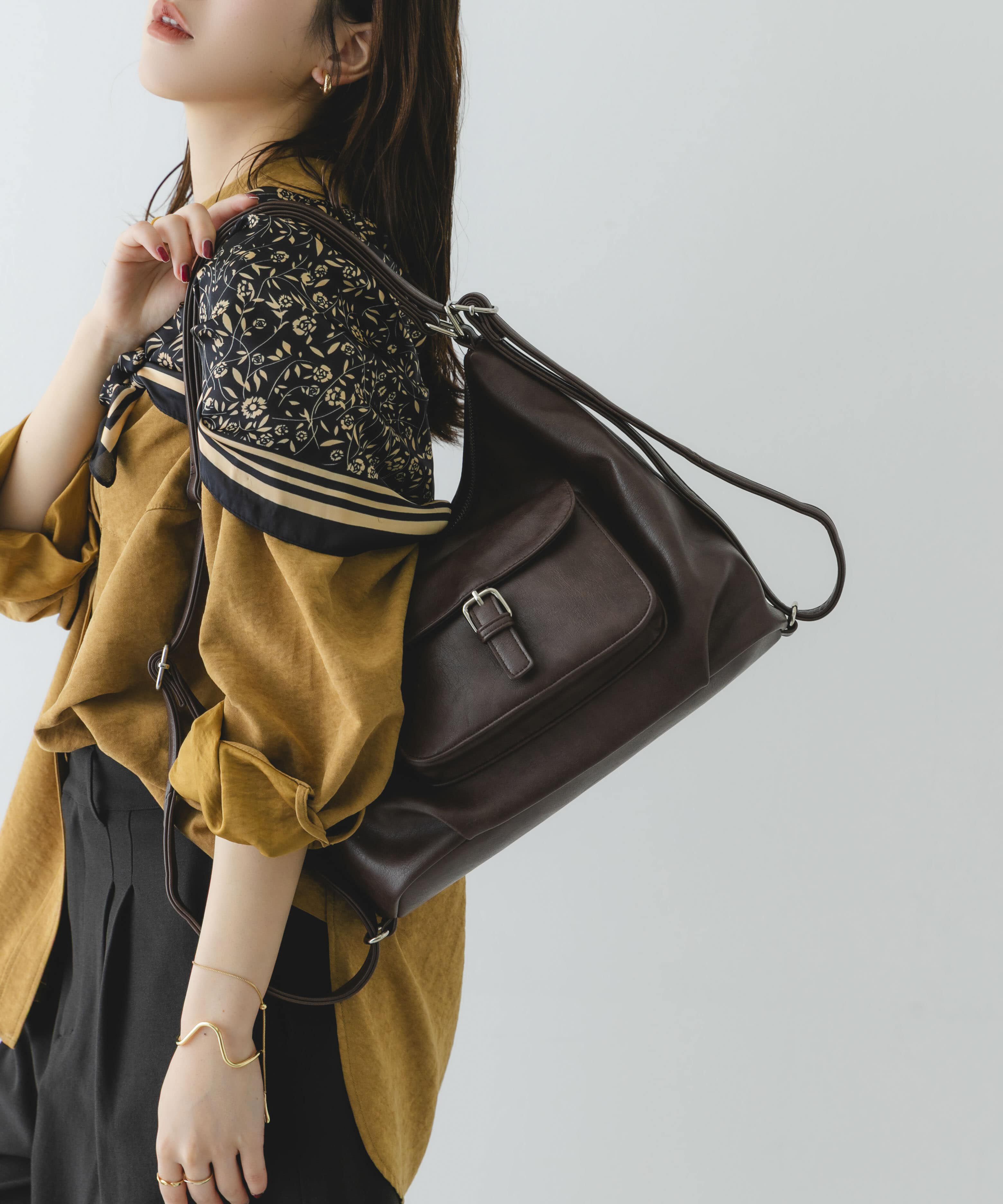 きれいめ派のための、上品2WAYリュック【Design】紐の持ち方次第でショルダーにもリュックにも使える2WAY仕様のマルチバッグ。合皮素材を使用しているため、カジュアルすぎず上品に持てるデザイン.. |