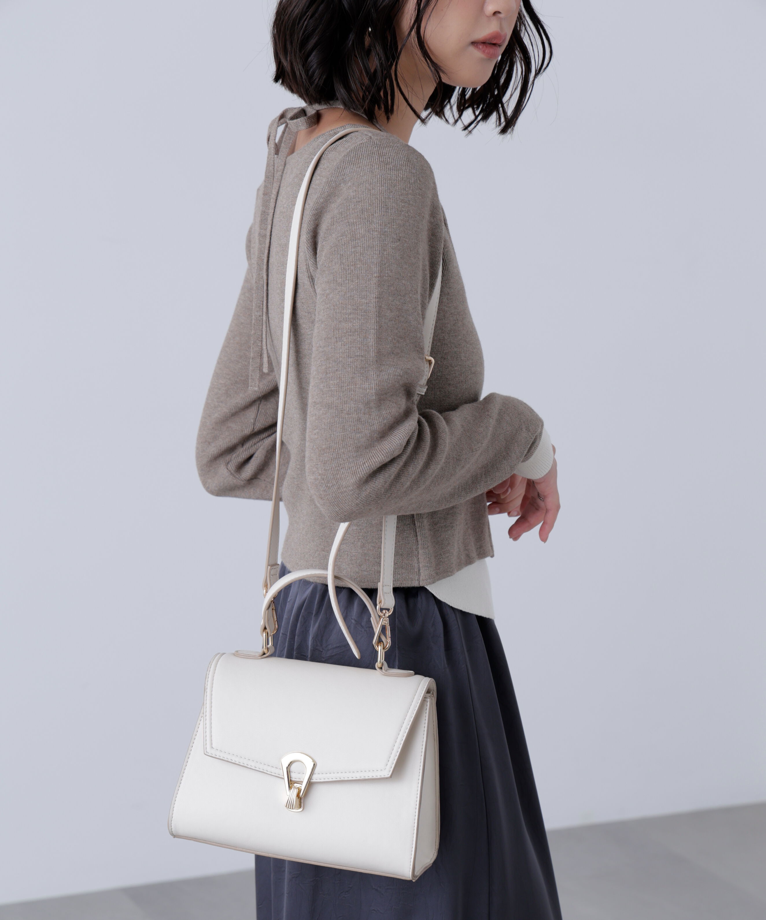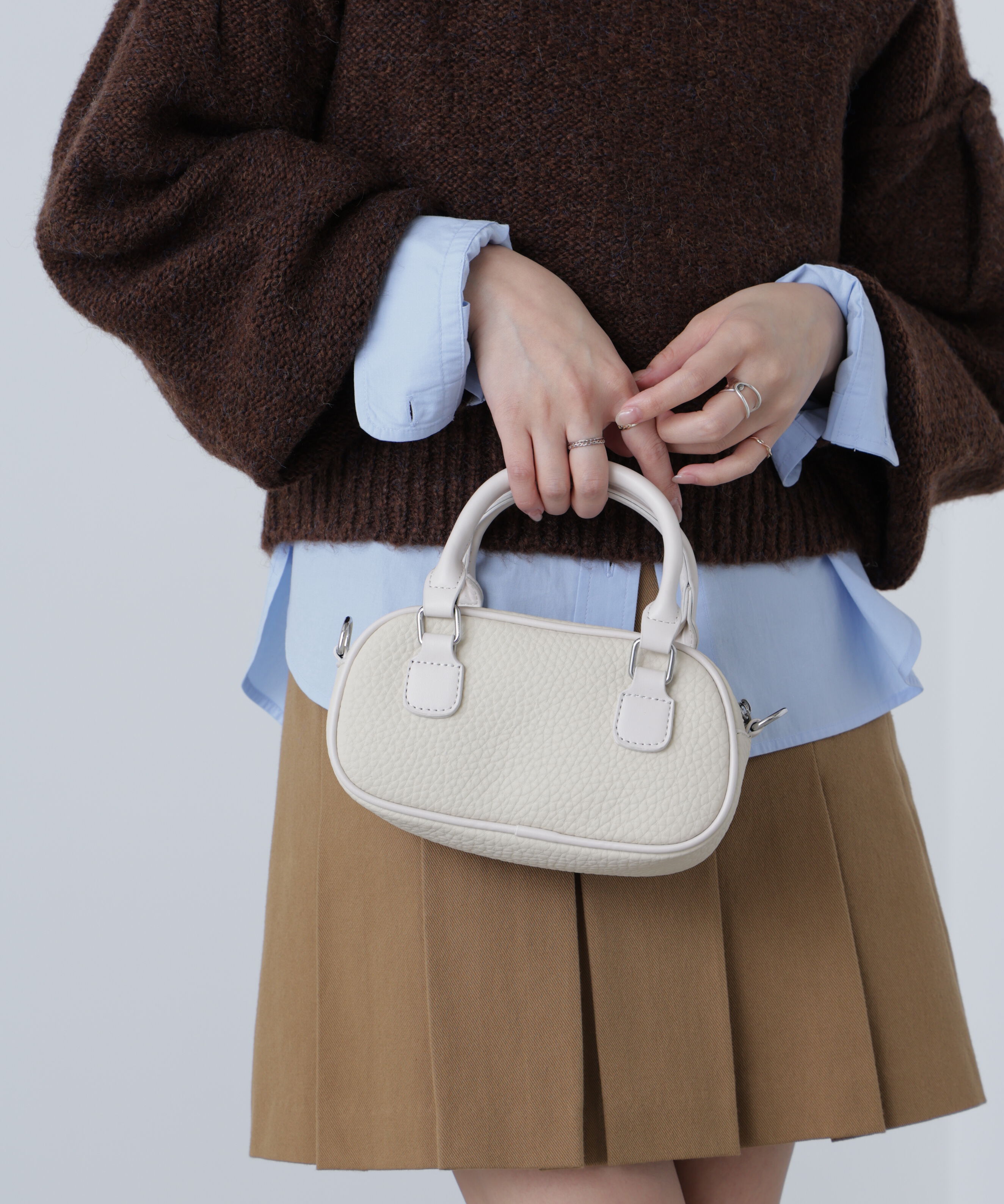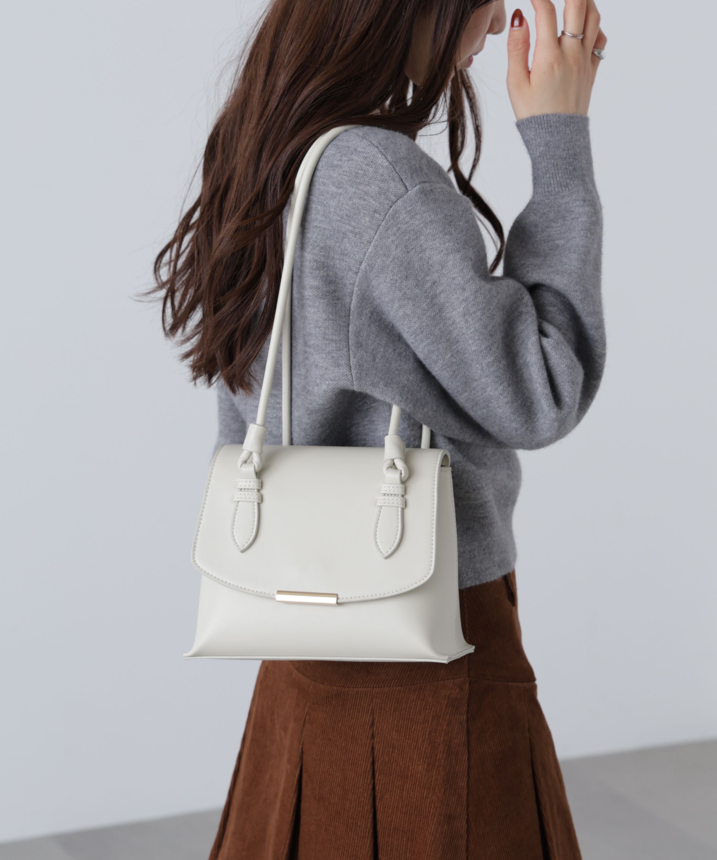 スタッズ使いが目を引く今季トレンドのショルダーバッグ。見た目以上に収納力があり、普段使いからちょっとしたお出かけスタイルまで活躍します。※モデルの着用画像の場合、光の当たり具合により、.. |