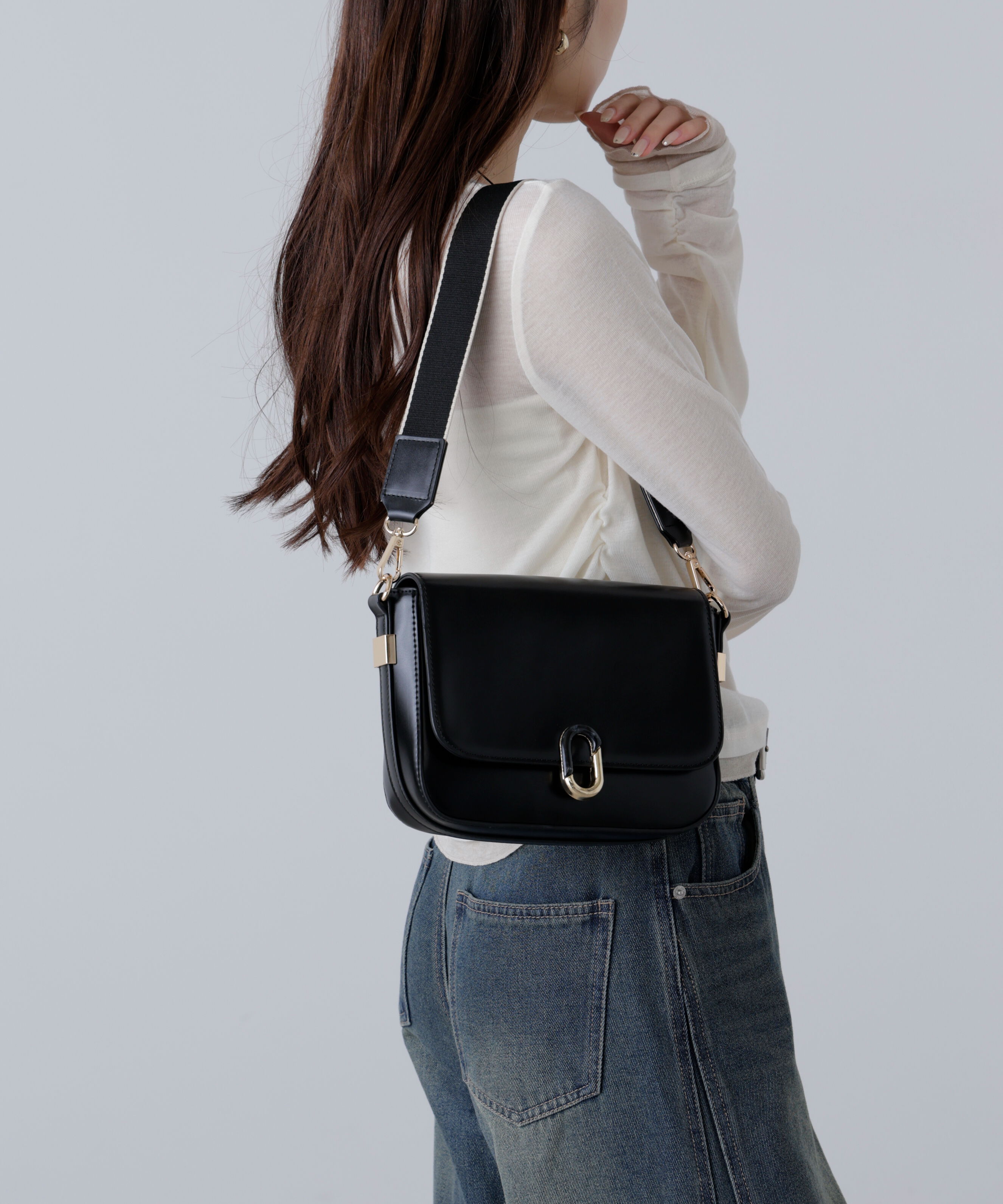 存在感のあるセンターバックルがポイントのショルダーバッグ。すっきりしたカーブフォルムが幅広いコーディネートに合わせやすいデザインです。見た目以上に収納力があり、普段使いからちょっとし.. |