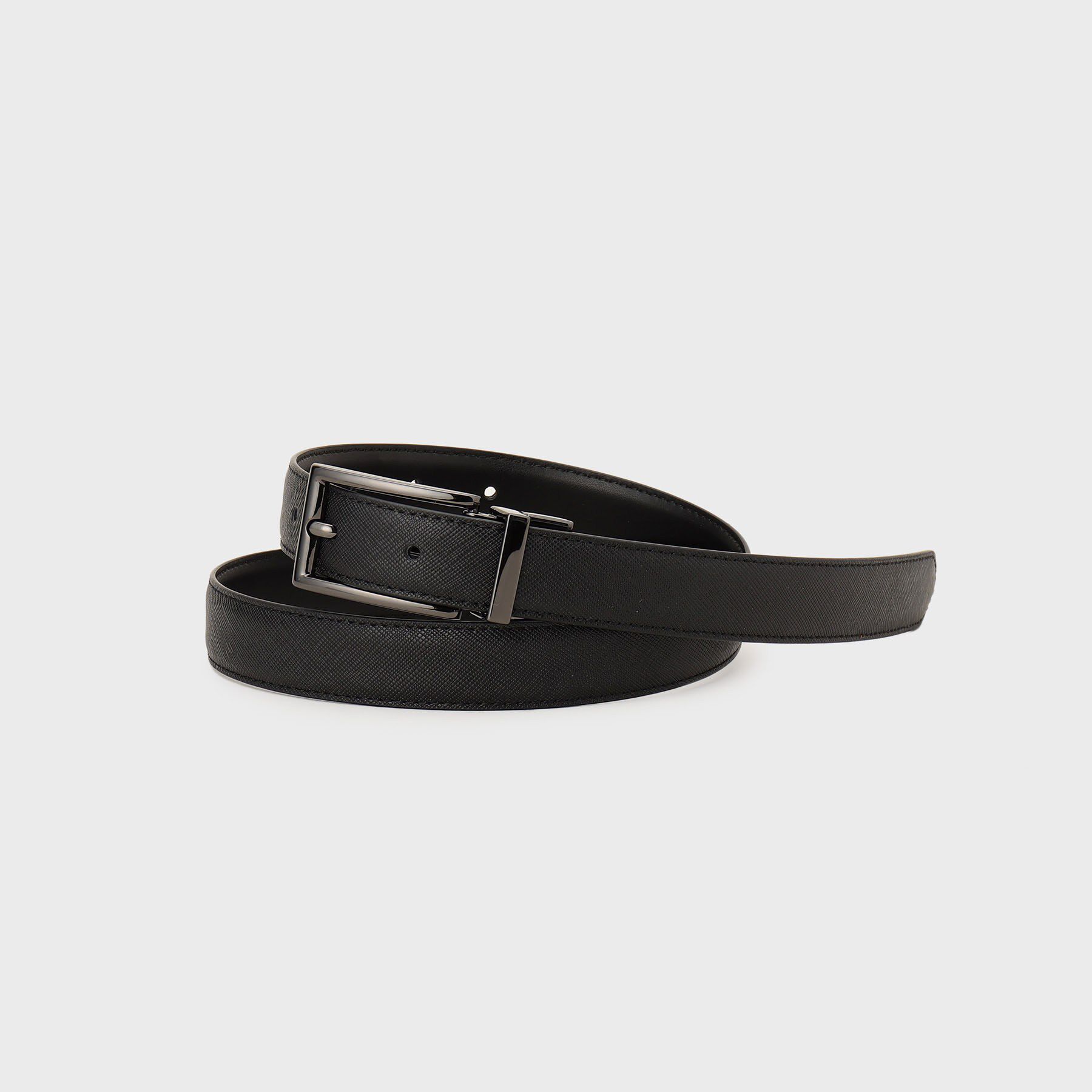 【デザイン】表裏で異なる表面のリバーシブル仕様のレザーベルト。カラー部分は傷が目立ちにくいサフィアーノ加工を施しています。細身な幅でありながら、ベーシックなフォルムにすることで、オフ.. |