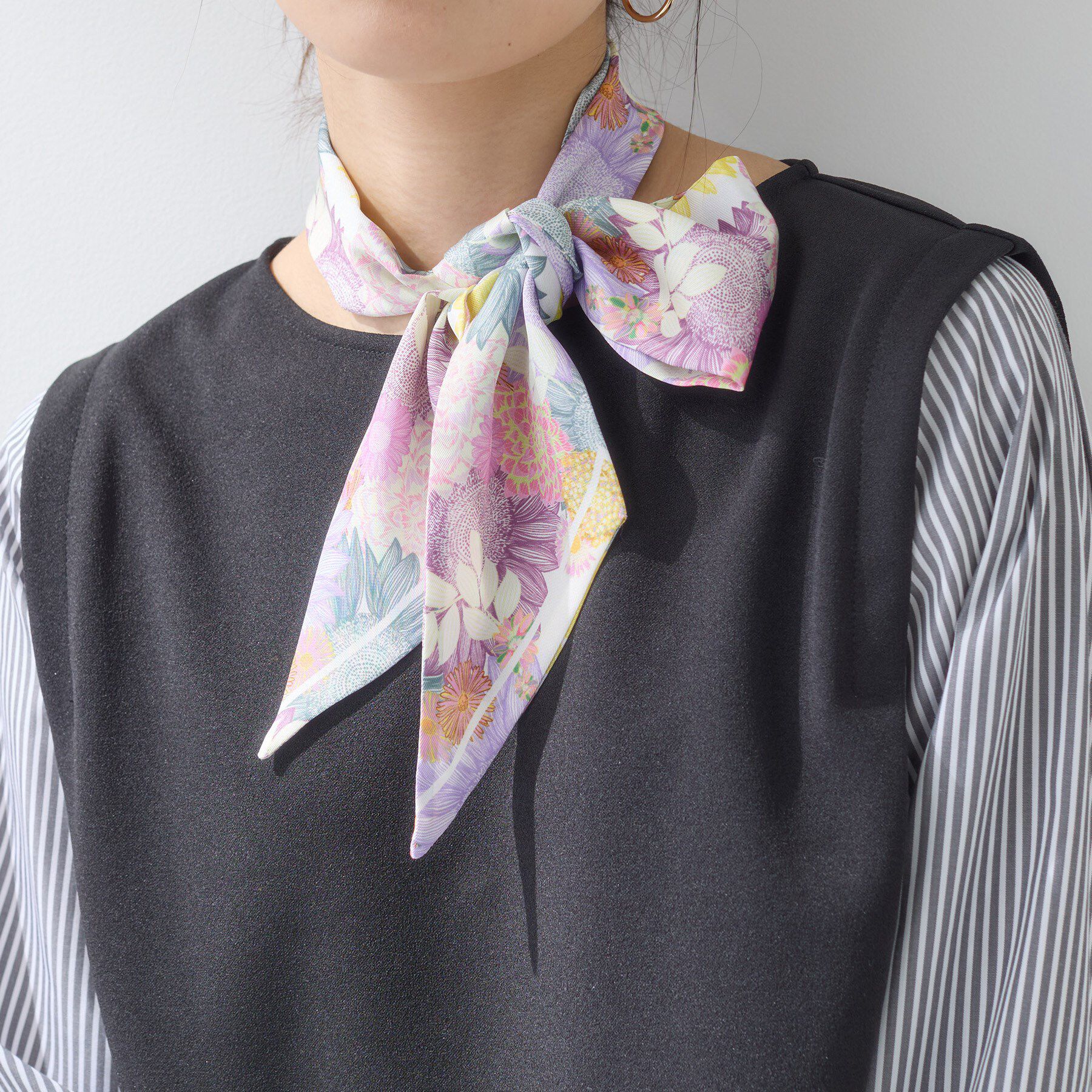 巻き方次第で表情が変わる、使いやすいナロースカーフ。【デザイン】コンパクトなサイズ感で扱いやすく、アレンジしやすいのがポイントです。首元で一度結ぶだけのシンプルなスタイルから、リボン.. |